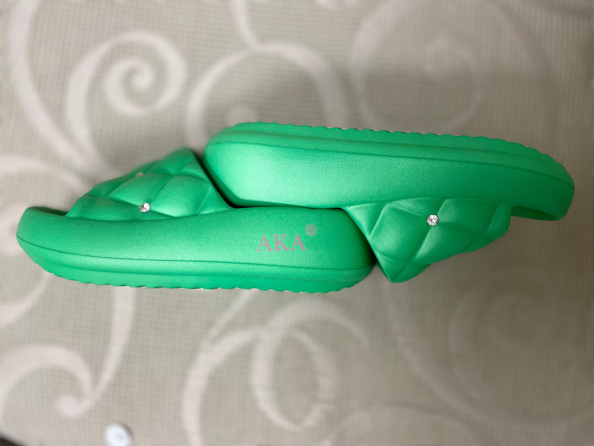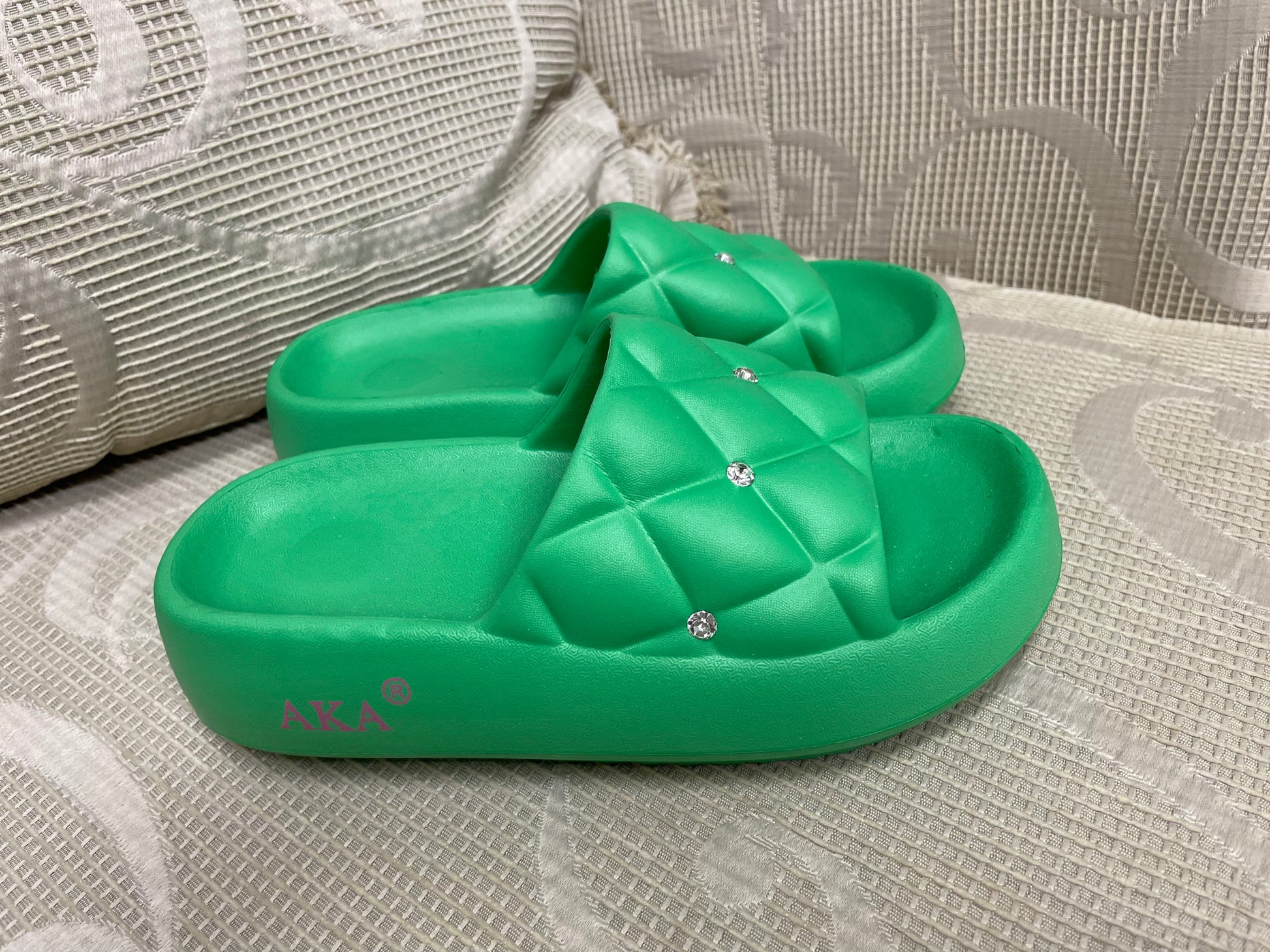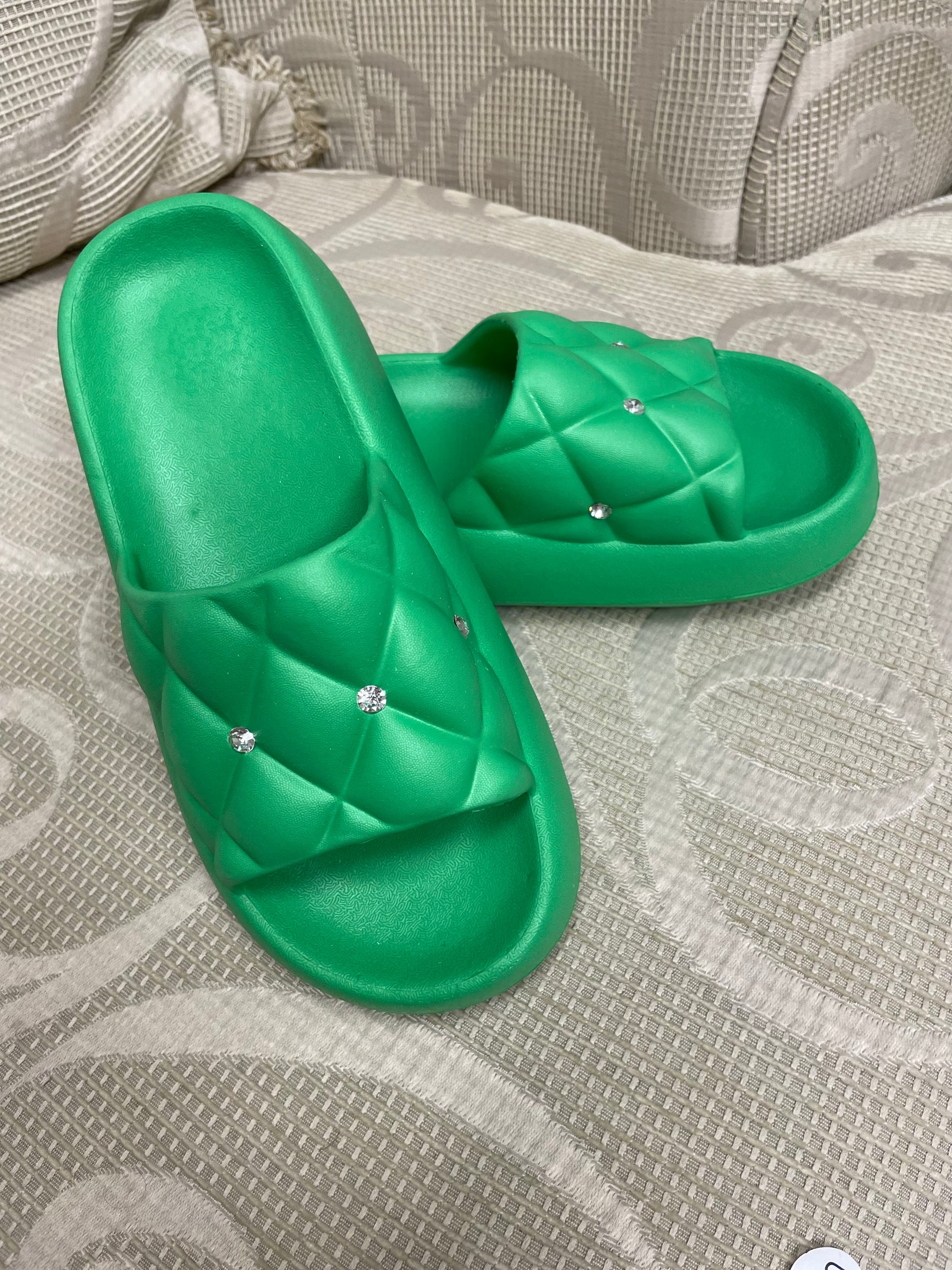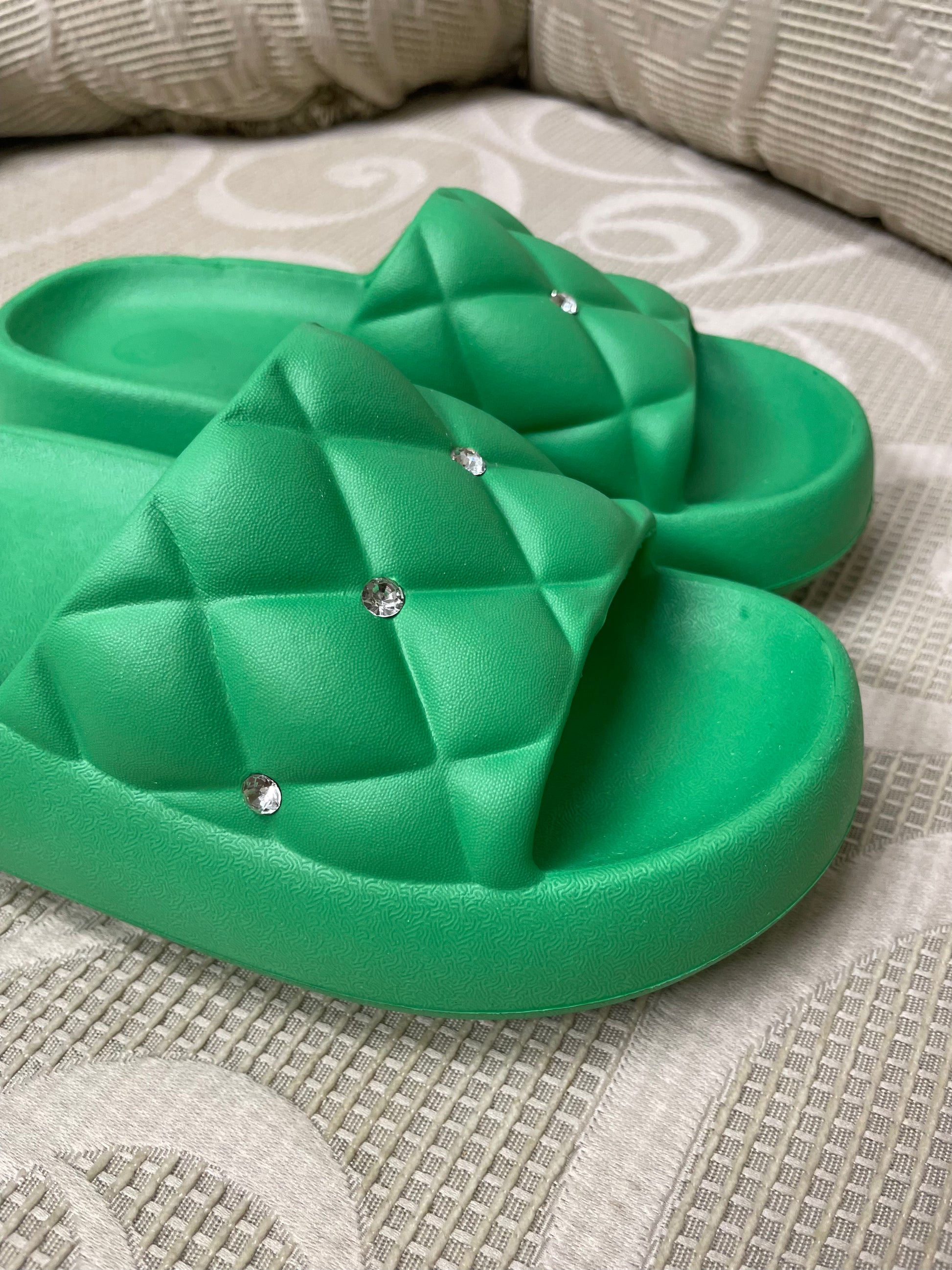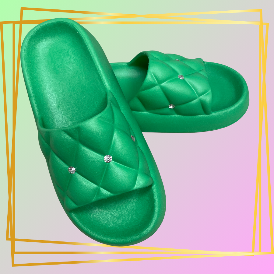 Step into style and comfort with our trendy green slide, featuring a chic waffle top design adorned with dazzling rhinestones. These slides aren't just about looks—they're the perfect blend of comfort and glamour. Whether you're strolling through a conference or need a quick change for tired feet, these comfy and cute slides are your go-to accessory. Elevate your footwear game with a touch of sparkle, making every step feel as good as it looks.