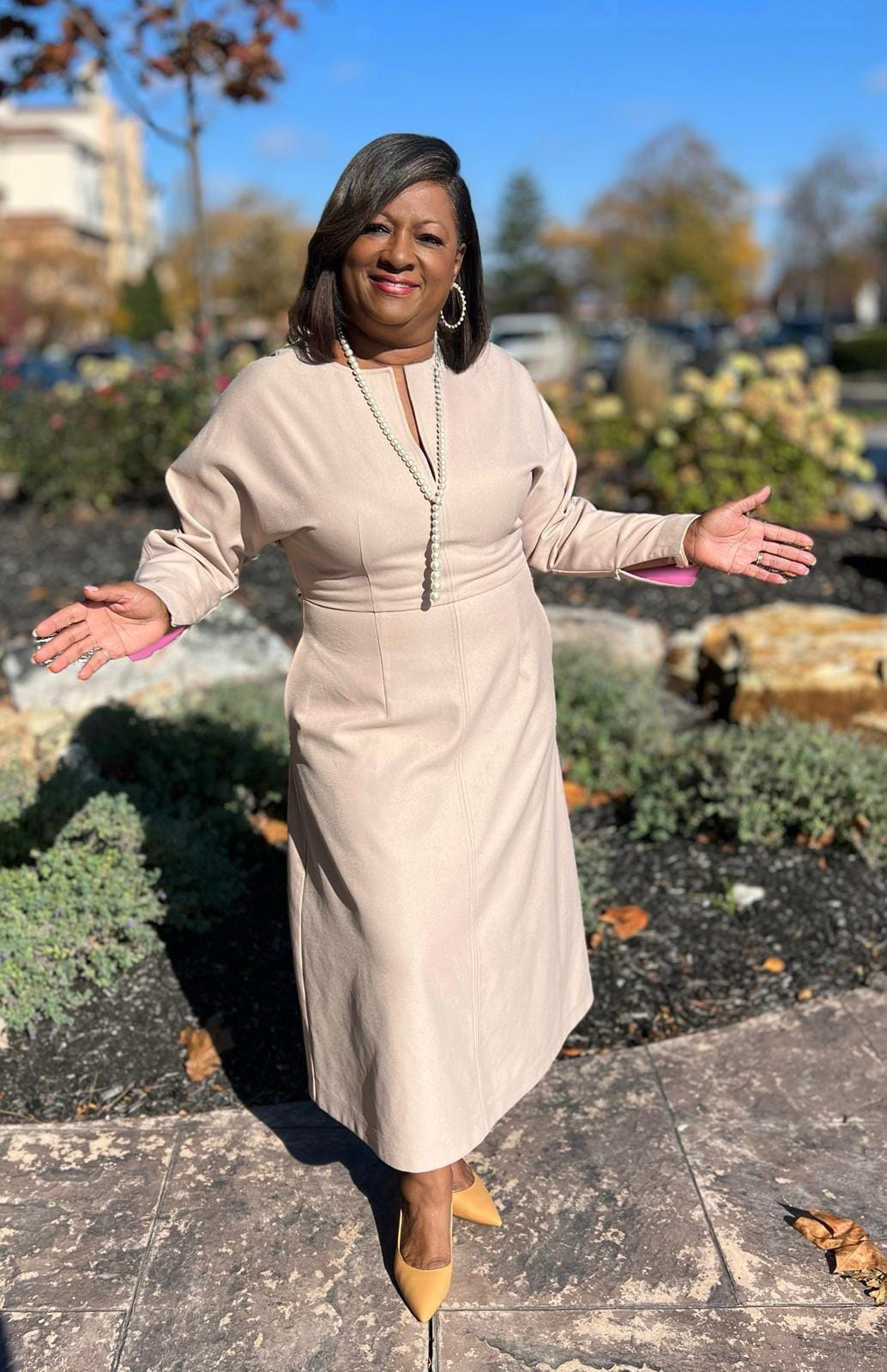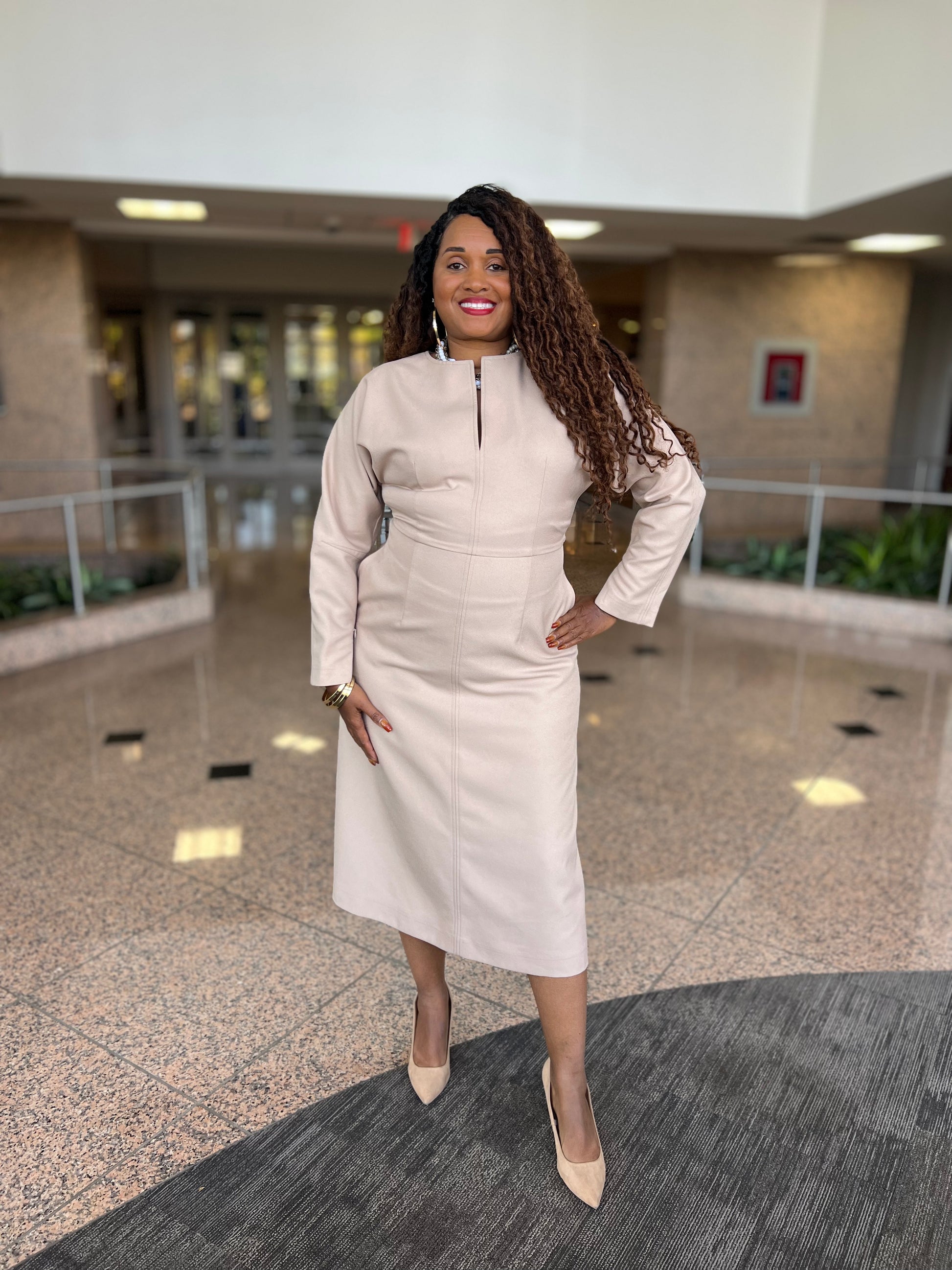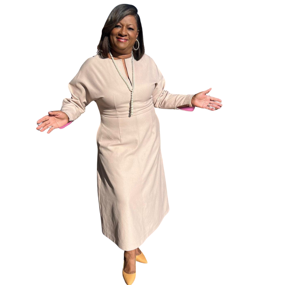 This graceful midi dress designed for the Central Region has day-to-evening appeal. The batwing sleeves add a dose of drama to the classic design, while an A-line midi skirt ensures an elegant fit. The material has give Unzip the sleeve for a peak of pink and the words alpha kappa alpha will be embroidered tone on tone around the collar.