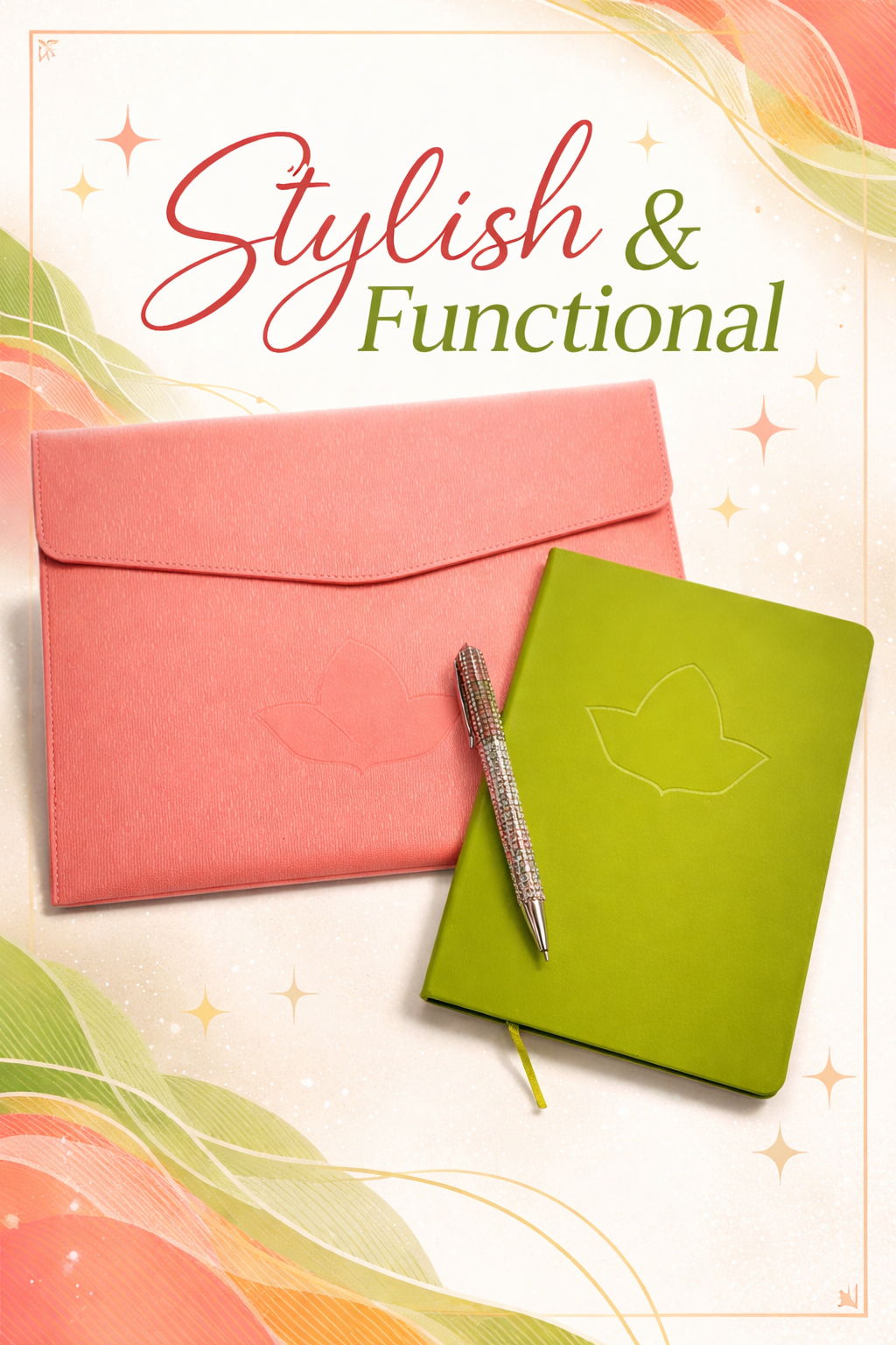 This chic 3-piece women's set is perfect for keeping you organized in style. The set includes a PU leather folder, Ivy stamped lined paper planner and a pink and green rhinestone ink pen. Together, these items make for a coordinated and sophisticated set, perfect for work, school, or personal use.