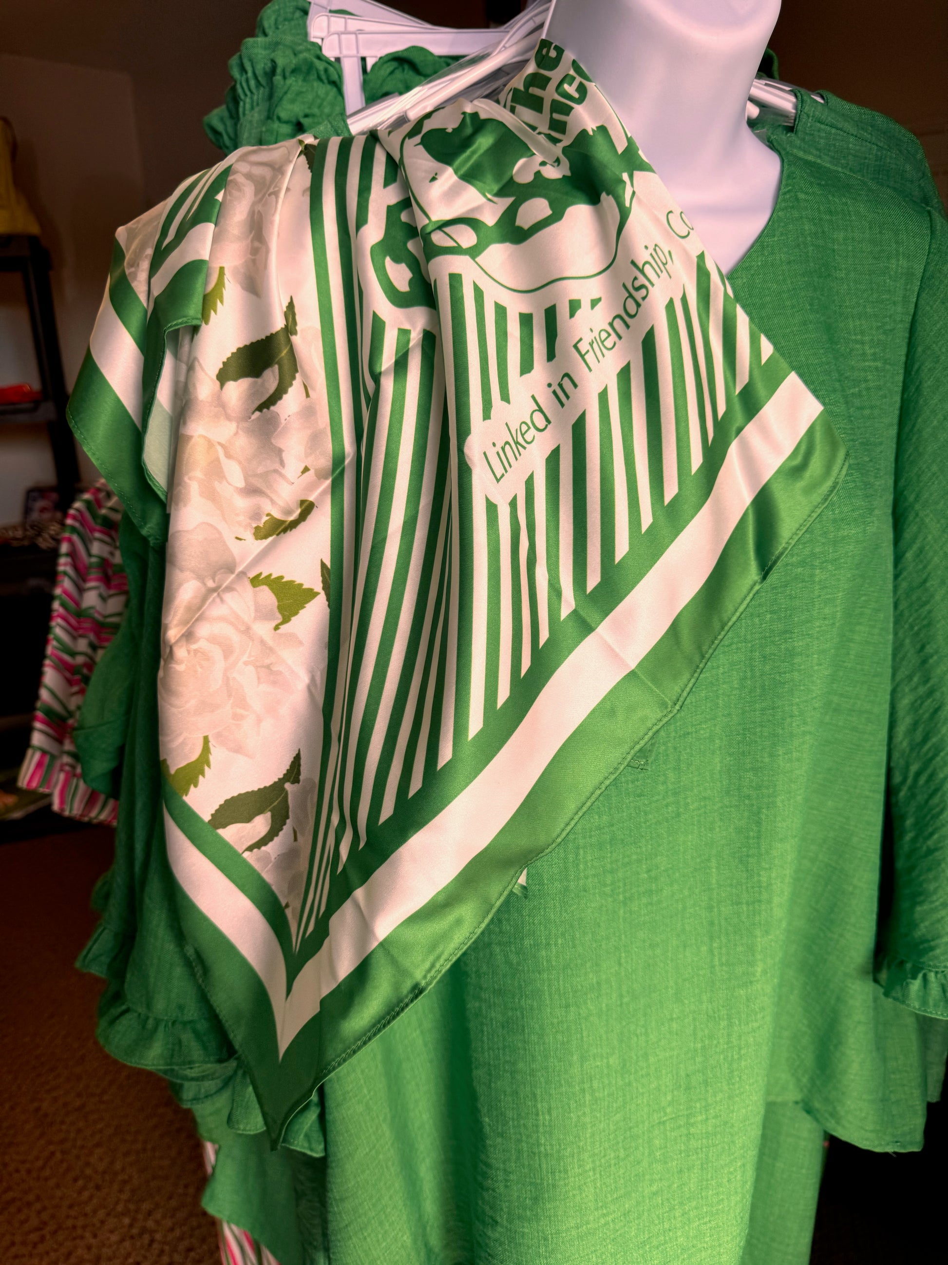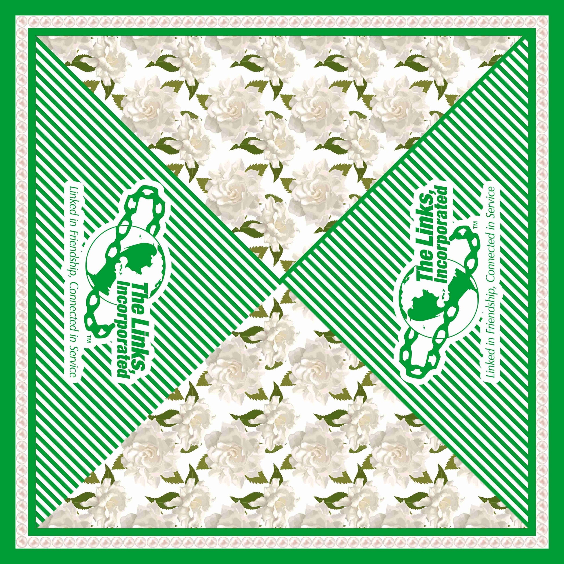 This stunning Links, Incorporated scarf is a timeless accessory designed to honor sisterhood with elegance. Featuring a delicate pattern of white roses and soft pearl accents, framed with bold green striping and The Links, Incorporated emblem, this scarf adds a touch of refinement to any outfit.