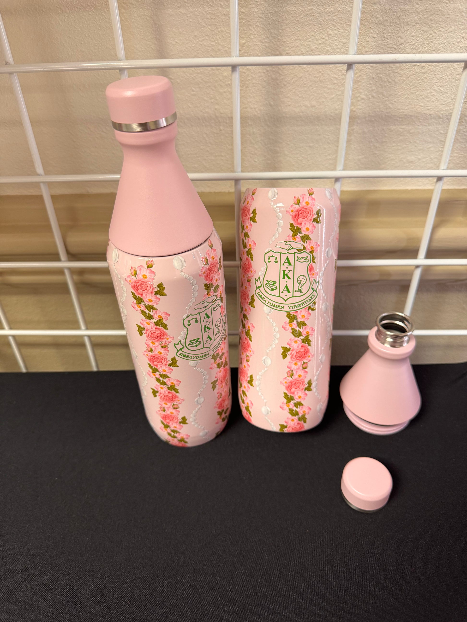 This 20oz limited-edition water bottle features a chic pink, Coke-shaped design adorned with beautiful roses and pearls. The bottle proudly displays the AKA shield, letting everyone know "who you with!" It's not only a stylish accessory but also highly functional, insulated to keep your drinks hot or cold for long hours. Perfect for personal use or as a thoughtful gift for a friend, this unique bottle is a must-have. With its limited availability, once it’s gone, it won't be restocked, making it even more special!