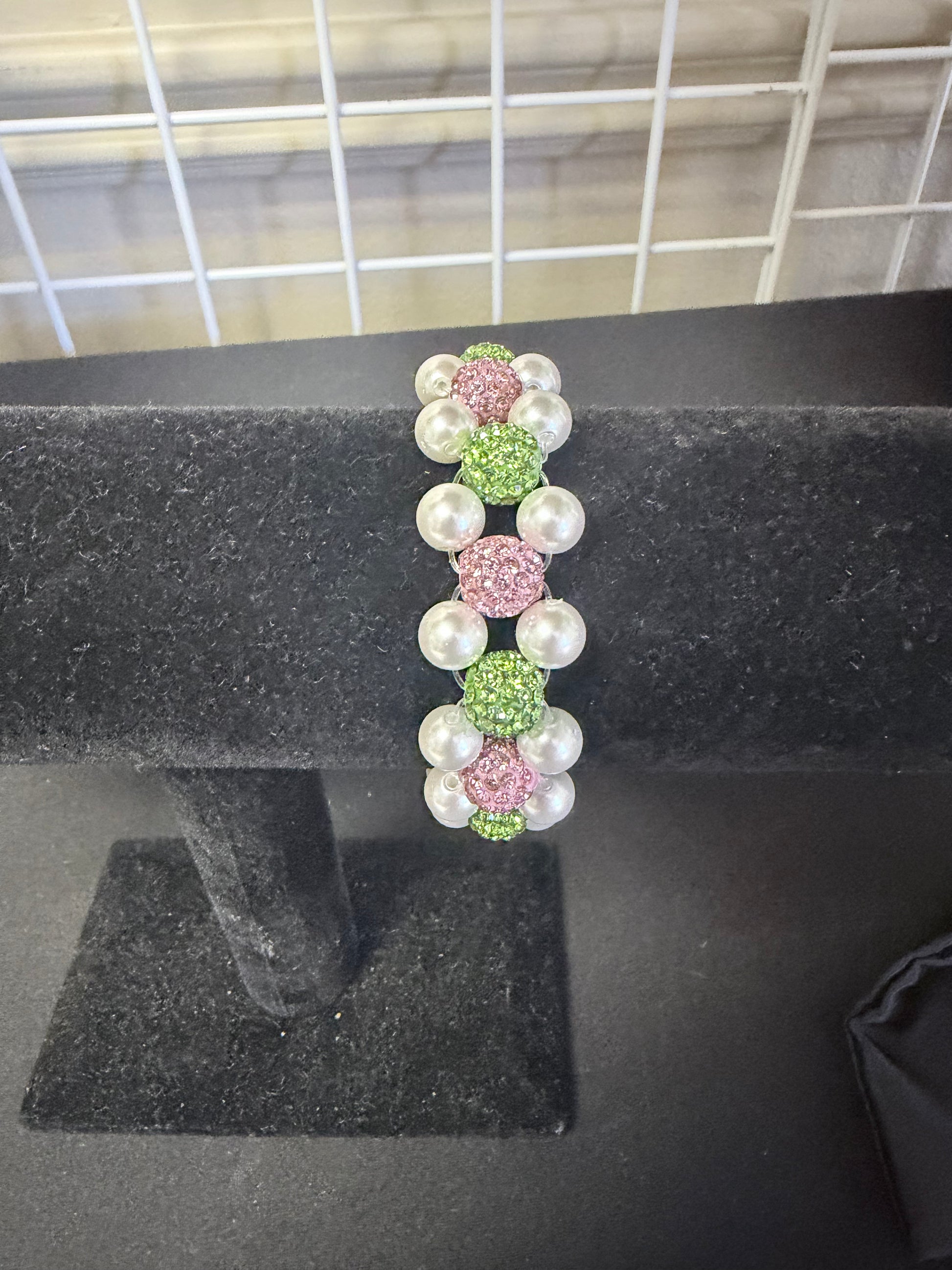 A stunning bracelet featuring alternating pink and green rhinestone beads accented with large pearl-like spheres, perfect for adding a touch of sparkle and elegance to any look.