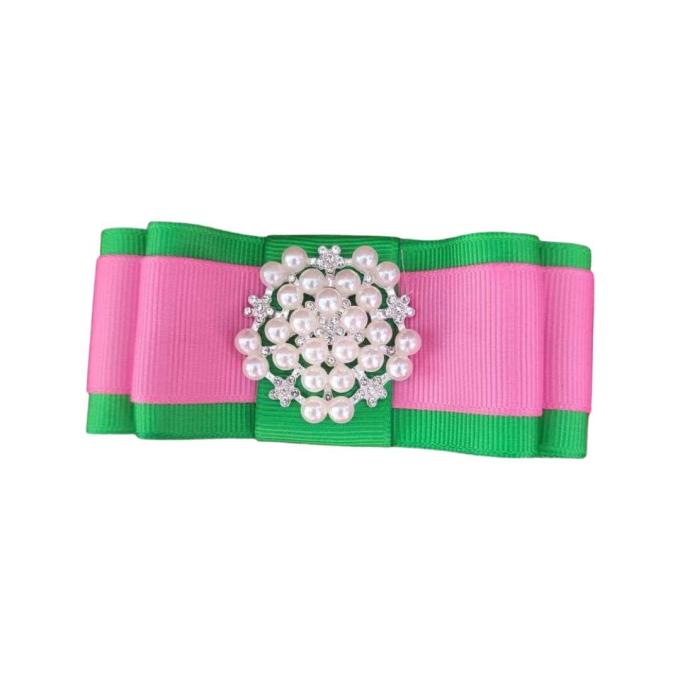 Shoe clips are a versatile and fashionable accessory that can be easily attached to any pair of shoes to add a touch of elegance in style. These particular shoe clips feature a charming, pink and green bow with a dazzling pearl and rhinestone center that adds a touch of sophistication in glamour to your footwear.