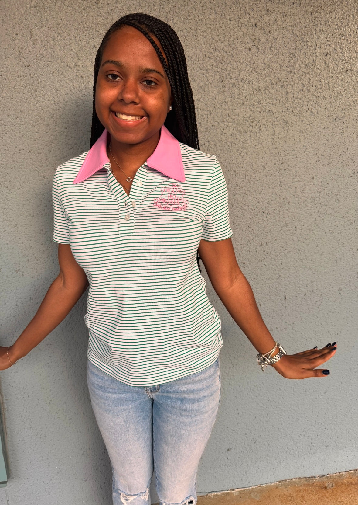 Fresh green with white stripe polo top. Light pink collar with matching embroidered shield. Perfect for summer days.