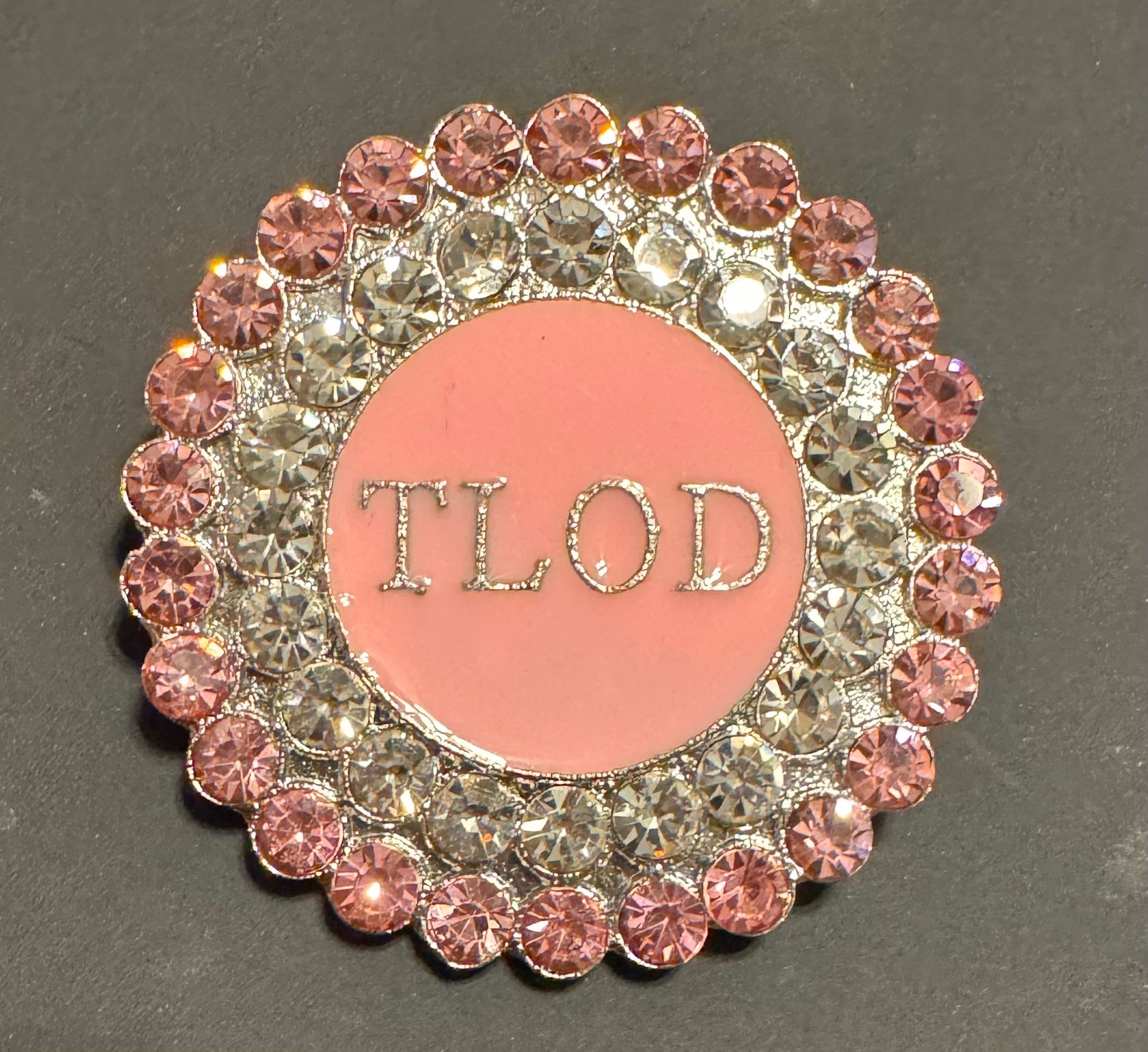 This exquisite Top Ladies of Distinction pin features a round design with a vibrant pink metal center, showcasing "TLOD" in sleek silver lettering. The disk is beautifully surrounded by two rows of rhinestones: a sparkling clear row followed by a radiant pink row. This pin is a perfect blend of elegance and boldness, making it a standout symbol of pride in the organization.