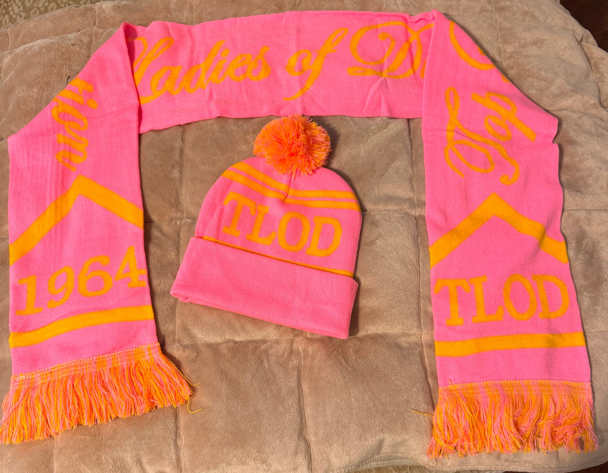 You'll be noticed in this stylish pink TLOD hat and scarf set. The scarf features "Top Ladies of Distinction" in gold print along with "1964" on one end and "TLOD" on the other. The matching hat is embroidered with "TLOD" in gold for a coordinated look.